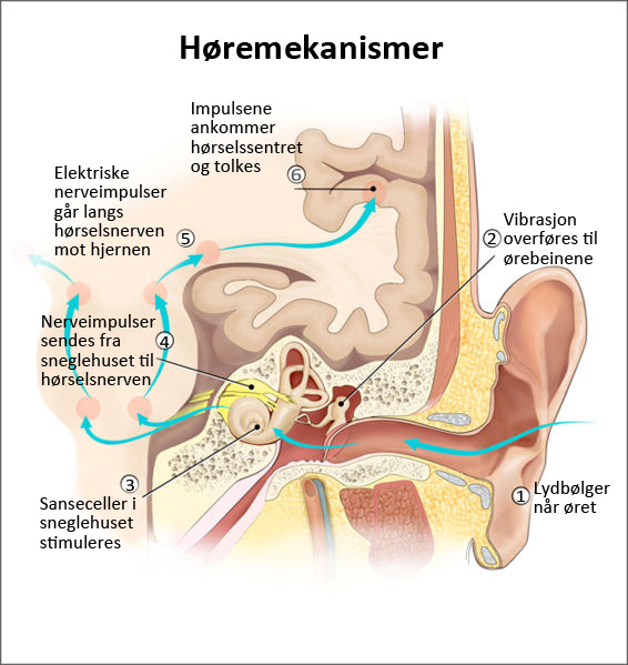 Cochleae har et utseende som er noe. Hammeren, ambolten og stigbøylen, til det ovale vinduet i sneglehusets vegg. I det indre øret er det væske som settes i sving når det ovale vinduet begynner å vibrere når det blir påvirket av høreknoklene. Disse vibrasjonene ledes gjennom mellomøret via tre bein: Auris) er en av kroppens legemsdeler og dets hovedfunksjon er å oppfatte (høre) lyd.